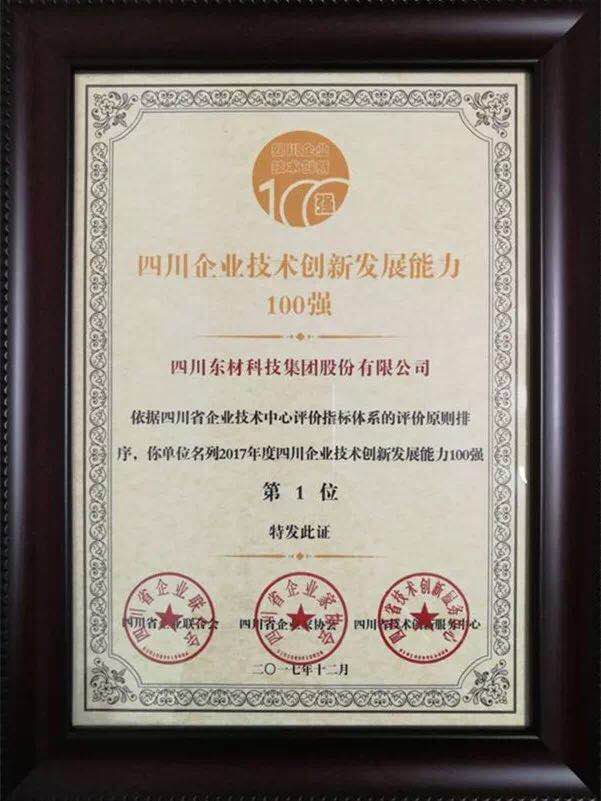 128日,2017四川100強企業發布會在成都舉行。四川東材科技集團股份有限公司在企業技術創新發展能力100 強中位列第一。